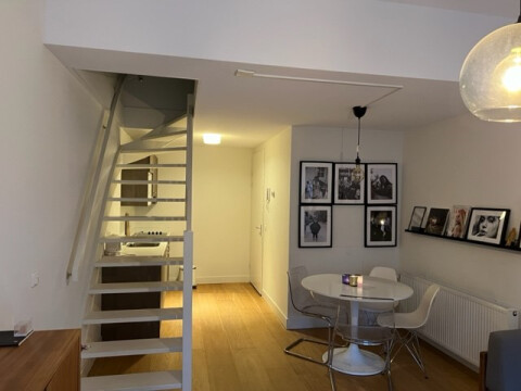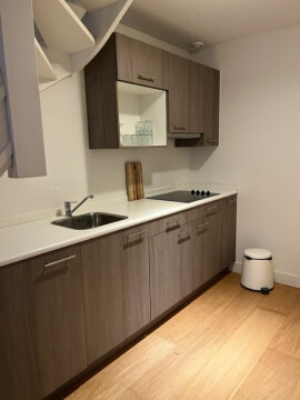 Entree, woonkamer met open keuken, badkamer met douche, wastafel en toilet en wasmachine aansluiting.
