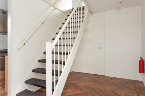 Middels vaste trap te bereiken verdieping met zeer riante badkamer voorzien van ligbad, douchehoek, wastafel en toilet. Woonkamer met direct toegang tot balkon. De woonkamer is voorzien van vloerbedekking en een automatisch zonnescherm aan de zuid-westgevel van de woonkamer. Slaapkamer gelegen aan de achterzijde van het pand.