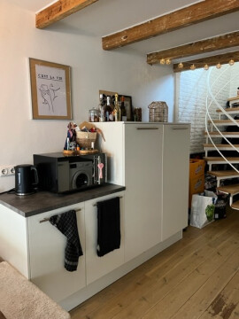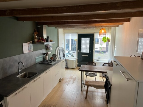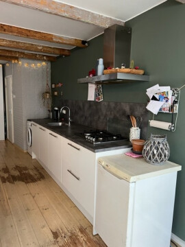 Begane grond, nieuwe woonkeuken met inbouwapparatuur, toilet met fonteintje, vaste trap naar 1e verdieping met de woonkamer en vaste trap naar 2e verdieping waar de slaapkamer met nieuwe badkamer zich bevindt.