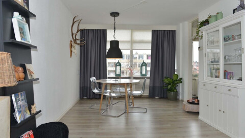 Royale woonkamer met deur naar ruim balkon (achterzijde) waar zich een bergkast bevindt, keuken voorzien van diverse apparatuur waaronder een 4p. gasstel en wasemkap. Vanuit de keuken is er toegang naar het 2e balkon (voorzijde).