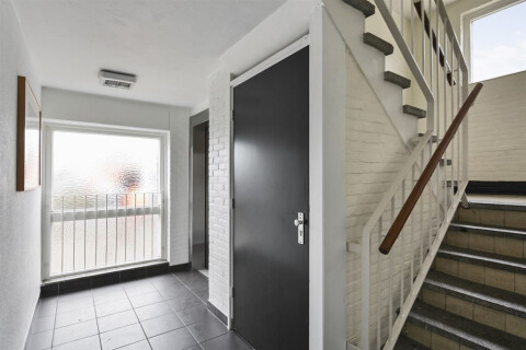 Indeling; b.g.g. entree met intercom, tweede verdieping; tochtportaal, hal met keuken, toilet en woonkamer met deur naar zonnig balkon, badkamer met ligbad, wastafel en 2 slaapkamers.