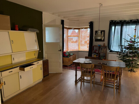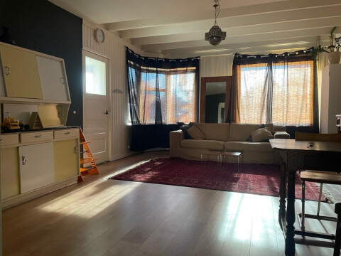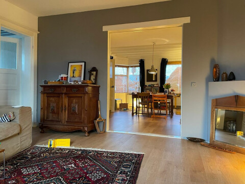 Begane grond: Entree met hal, trapopgang en doorgang naar de woonkamer en keuken. De royale woonkamer is voorzien van een laminaatvloer en bestaat uit een voor- en achterkamer die gescheiden worden door schuifdeuren. De tuin is te bereiken via de openslaande deuren aan achterzijde. De originele keuken is voorzien van diverse inbouwapparatuur. De gemoderniseerde badkamer (met wastafel in meubel, douche (+cabine) en wc bevindt zich achter de keuken.