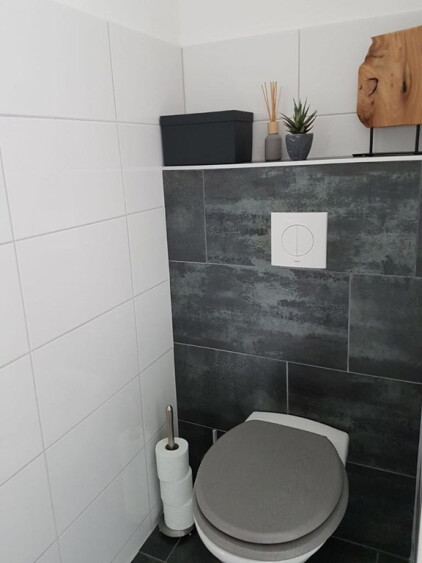 Zeer moderne badkamer met douche en wastafel, slaapkamer
