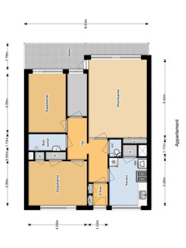 Entree, meterkast, toilet, gesloten keuken, C.V. opstelplaats, provisiekast, royale woonkamer met vaste kast en doorloop naar balkon gesitueerd op het zuiden. Tussenhal met 2 slaapkamers en badkamer.